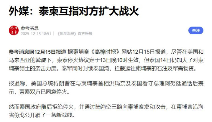 值得注意的是泰国认为自己是在自卫反击,柬埔寨则坚信国际法院的裁决大多站在自己这边,拥有道义支持,这种认知上的鸿沟和恩怨纠缠,让外部调停变得异常困难。