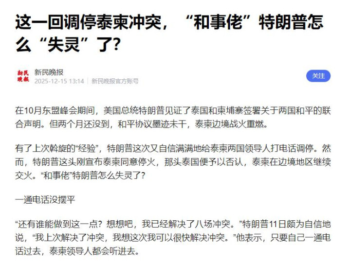 12月12日特朗普在社交媒体上高调宣布已经和两国领导人通电话,双方同意停火,他甚至暗示这是“诺贝尔和平奖”级别的成就,却没料到很快就被现实打脸。